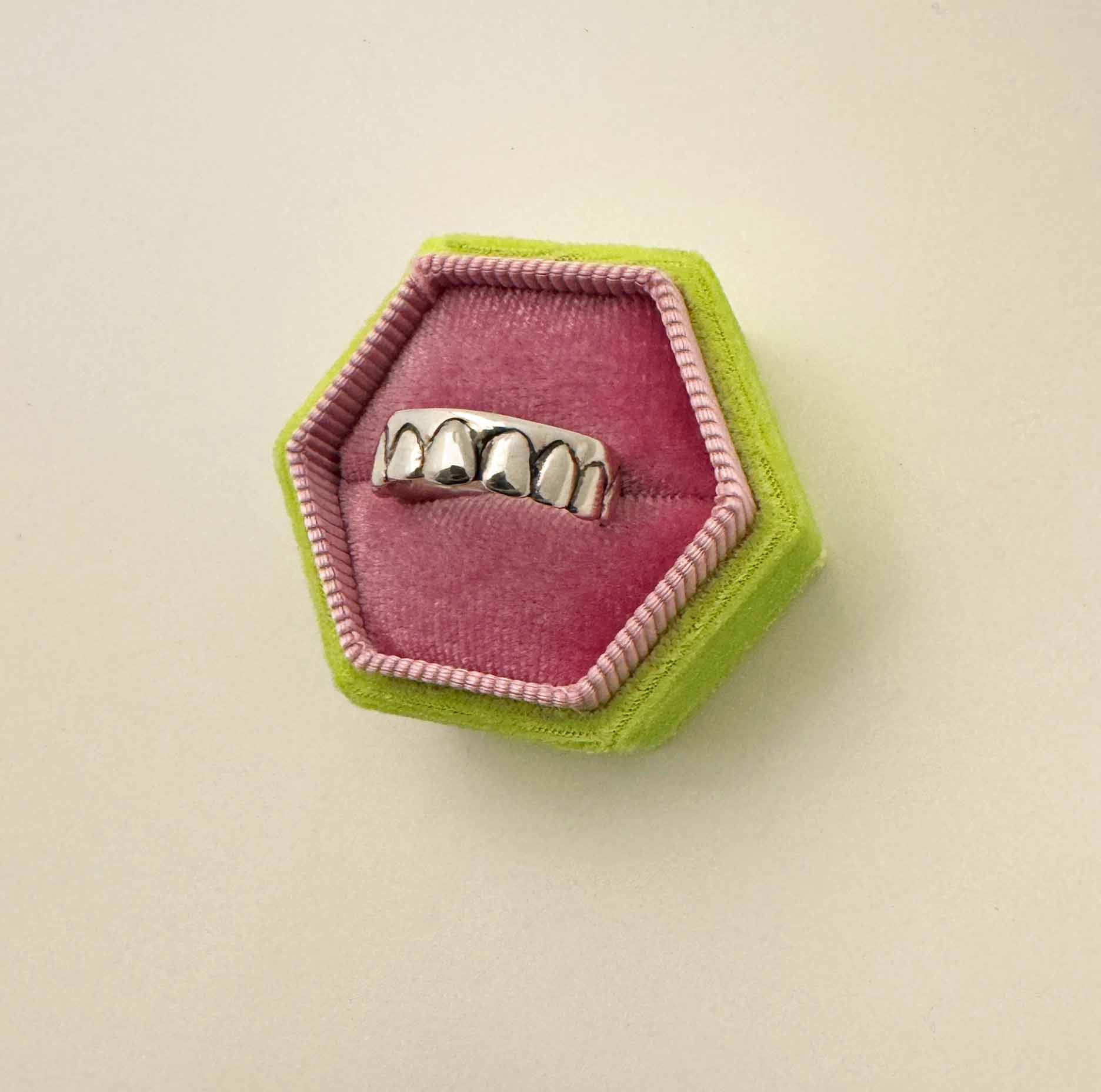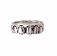 Teeth are relics of transformation, marking the passage of time, growth, and the things we leave behind. A grin can be a threat, a promise, or a weapon, and this ring captures that edge. Whether you see it as a totem of resilience, a badge of defiance, or a wink to the beautifully unsettling, it’s a piece that carries weight—both in silver and in meaning.