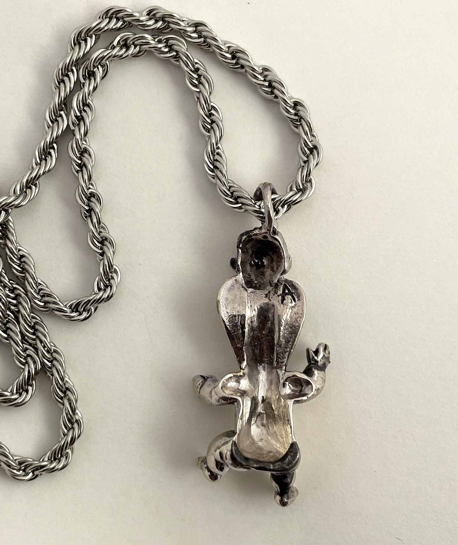 Charms hangs 1 1/2 inches from the chain. The stainless steel chain is 20 inches long. The cobra baby is 1 3/4 tall and Just under 1 inch at its widest.