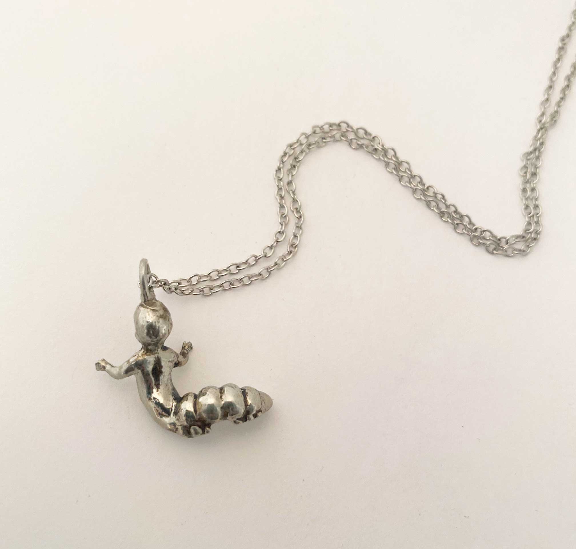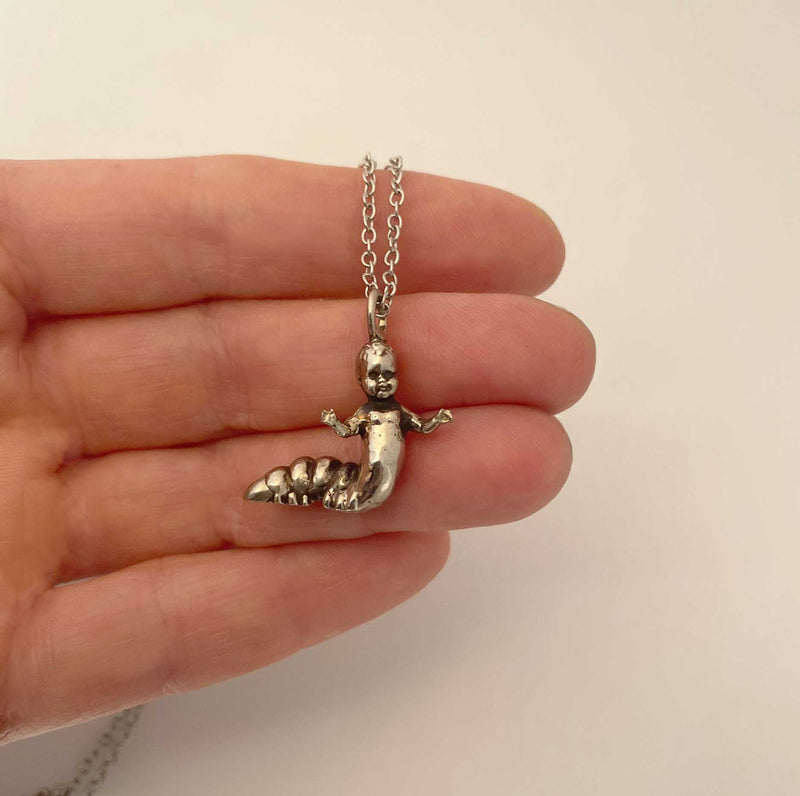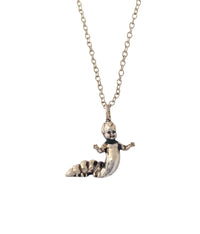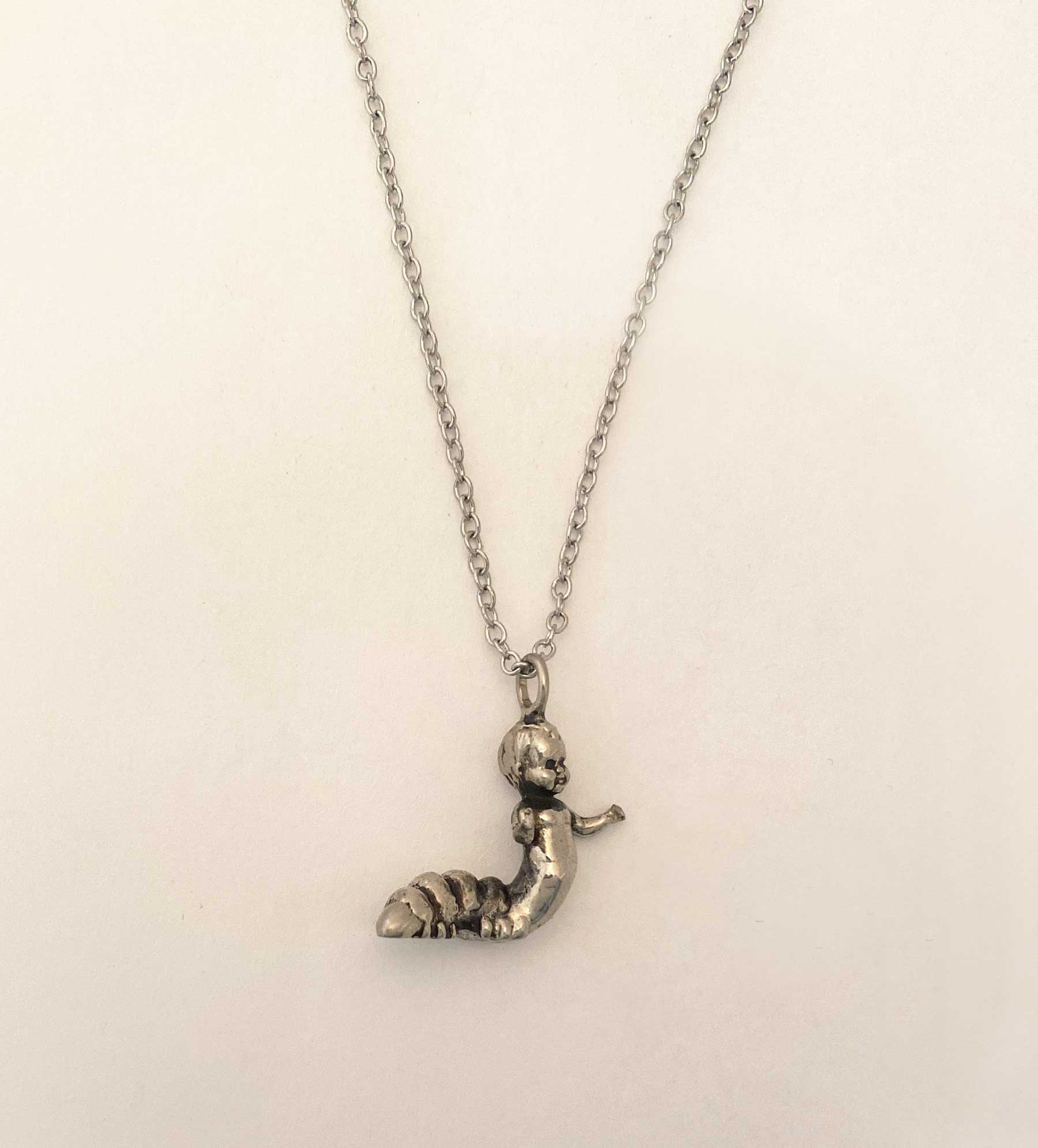 This hybrid of caterpillar and baby doll made into a charm necklace is the newest in a group of strange and unusual charms I made during the beginning of quarantine during the pandemic in NYC. Strange times call for strange creations.