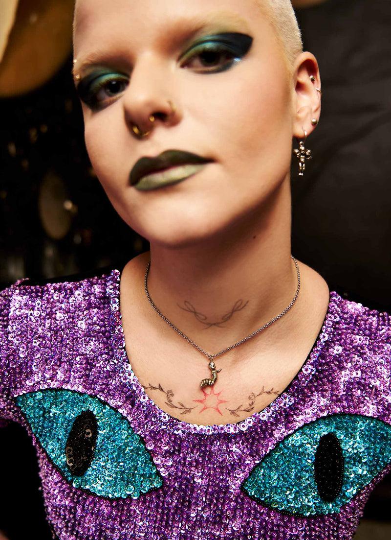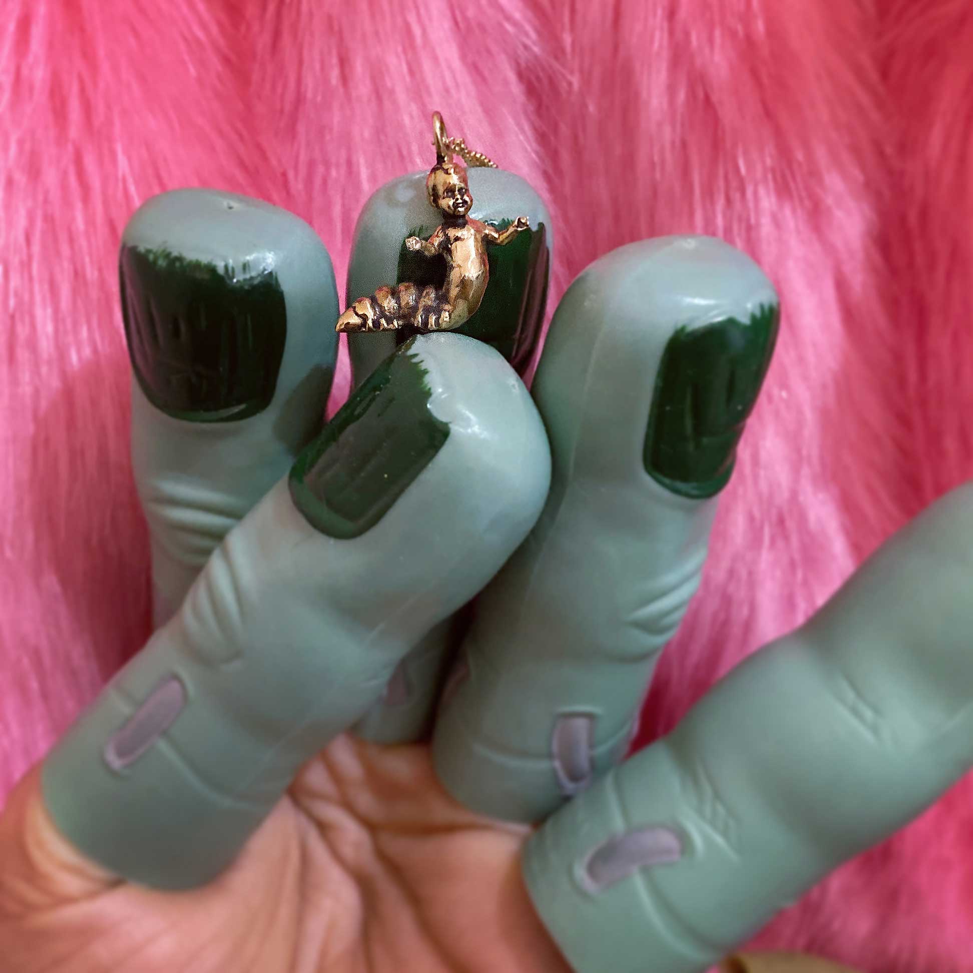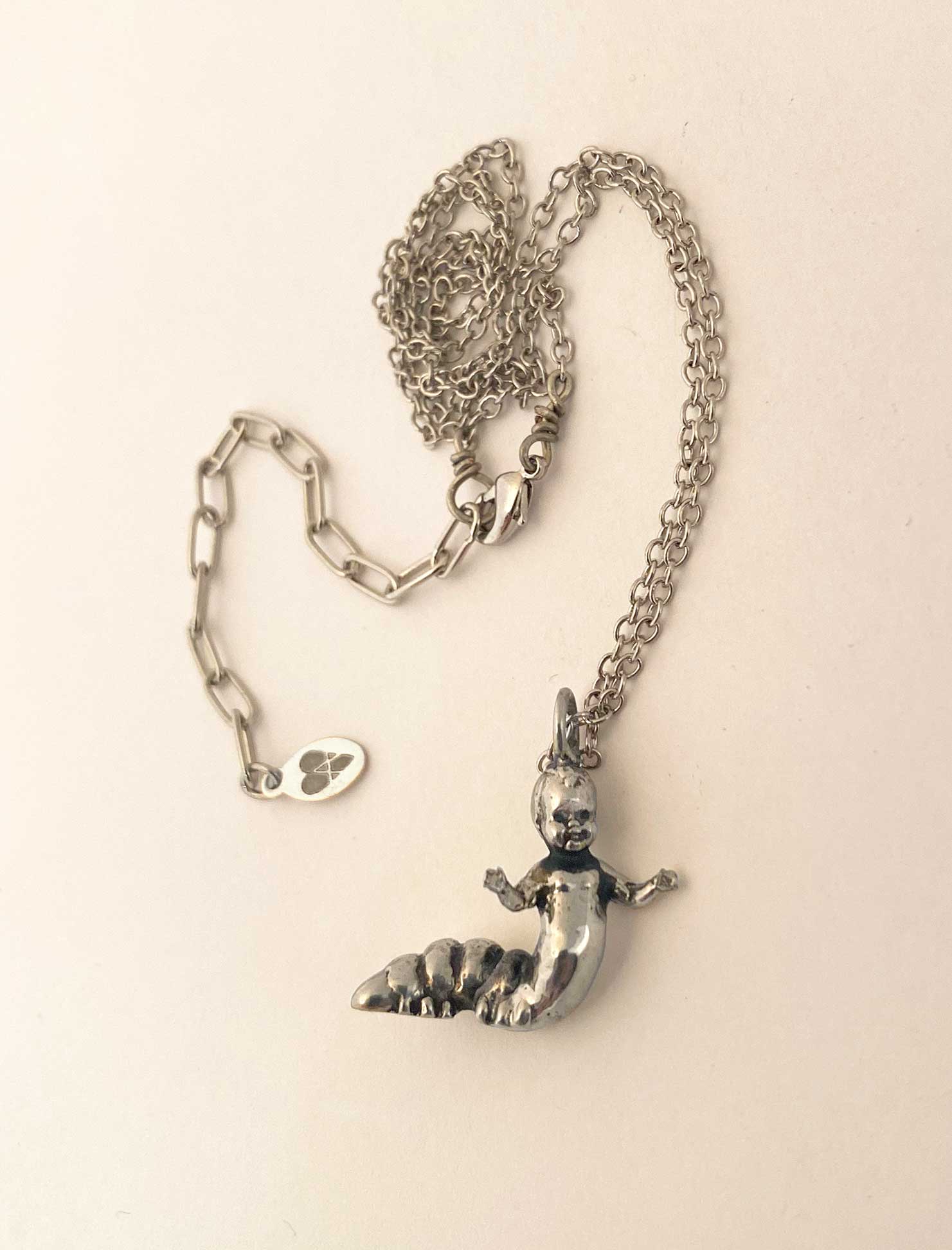 This hybrid of caterpillar and baby doll made into a charm necklace is the newest in a group of strange and unusual charms I made during the beginning of quarantine during the pandemic in NYC. Strange times call for strange creations.