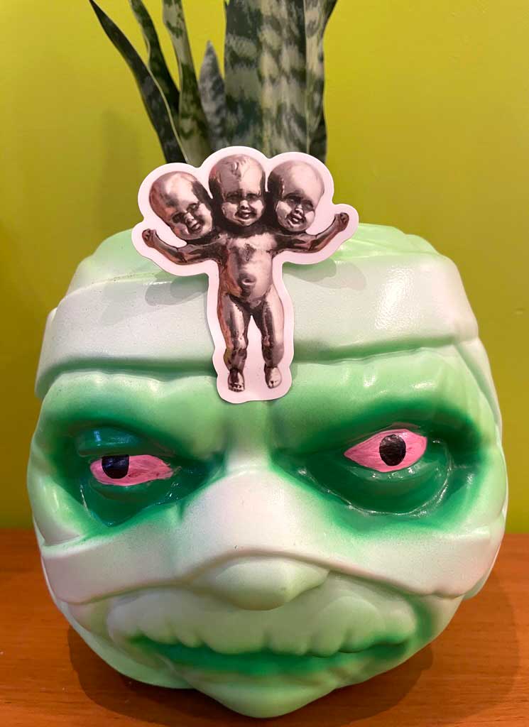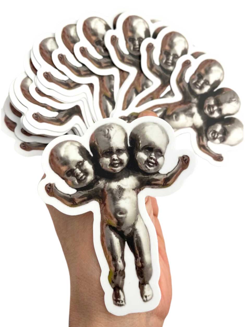 A waterproof, vinyl sticker of one of Anomaly Jewelry's most popular designs, the Three Headed Baby. These custom die cut stickers are made from durable vinyl with a laminate that protects it from scratching, rain, and sunlight. Free shipping within the U.S.!