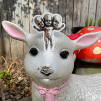 I made these stickers from a photo I took of the 3 headed baby necklace that I hand make. Unlike the Three Headed Baby Ring or the Three Headed Baby Necklace, you can put this sticker ANYWHERE!!!!! Please see photos for ideas. Innovative places include water bottles (It's water proof!!), your computer, and, your bicycle! Not quite weird enough? NO PROBLEM! I made a glow-in-the-dark version of this cutie as well.