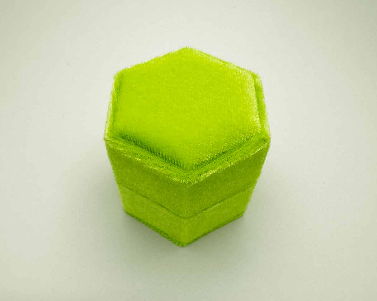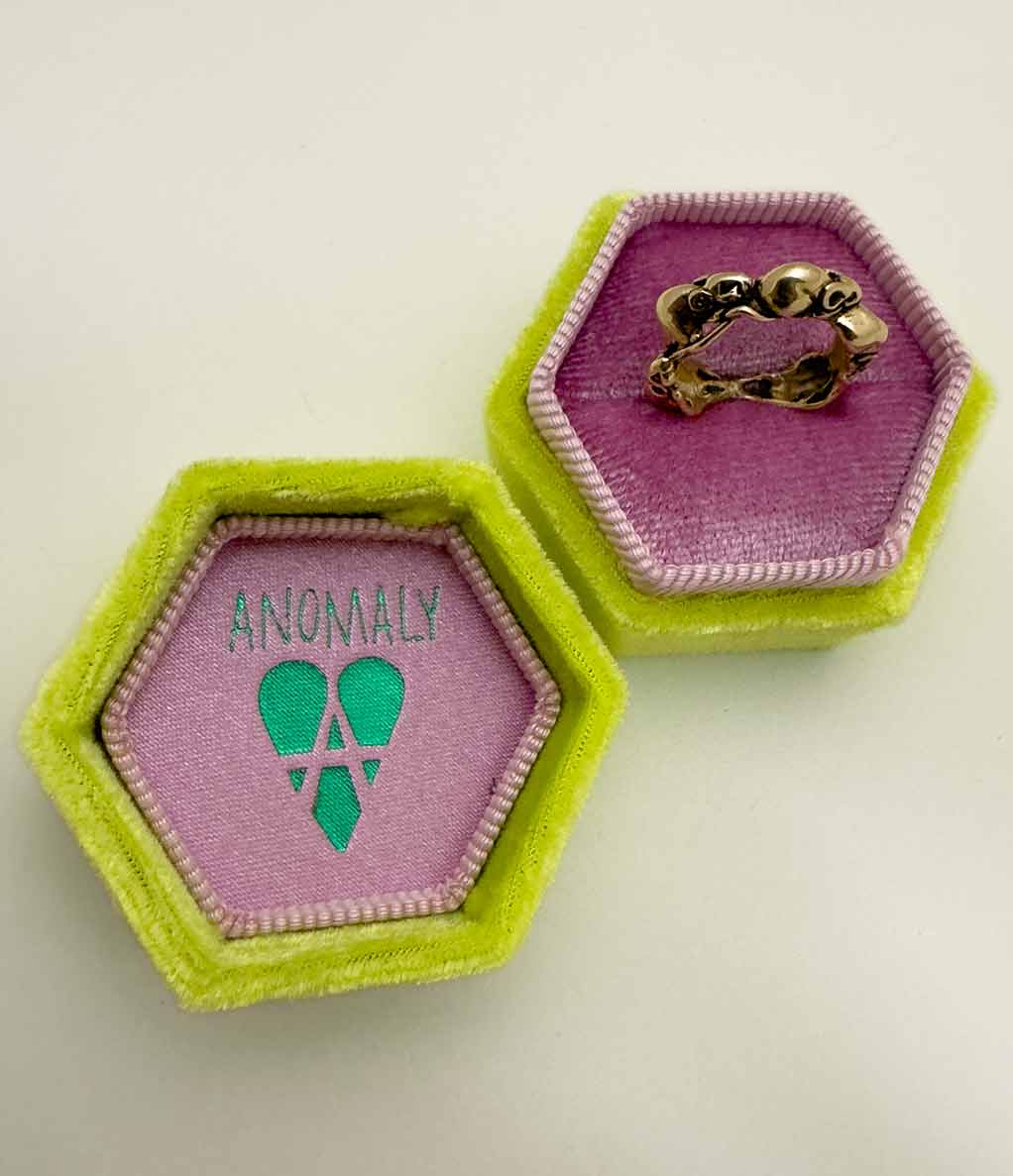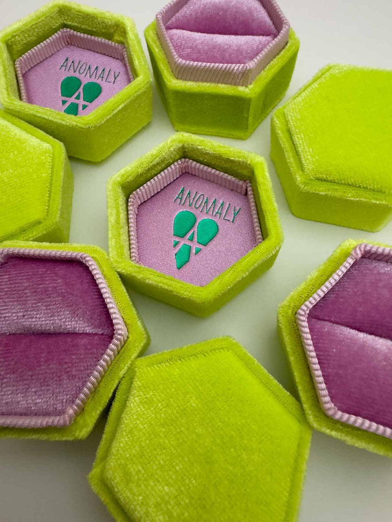 Anomaly's Green Velvet Ring Boxes are a storage solution as bold and uncommon as the pieces it protects. Wrapped in electric neon green velvet and lined with plush, candy-pink goodness, this box is here to cradle your rings with that perfect mix of luxe and strange.