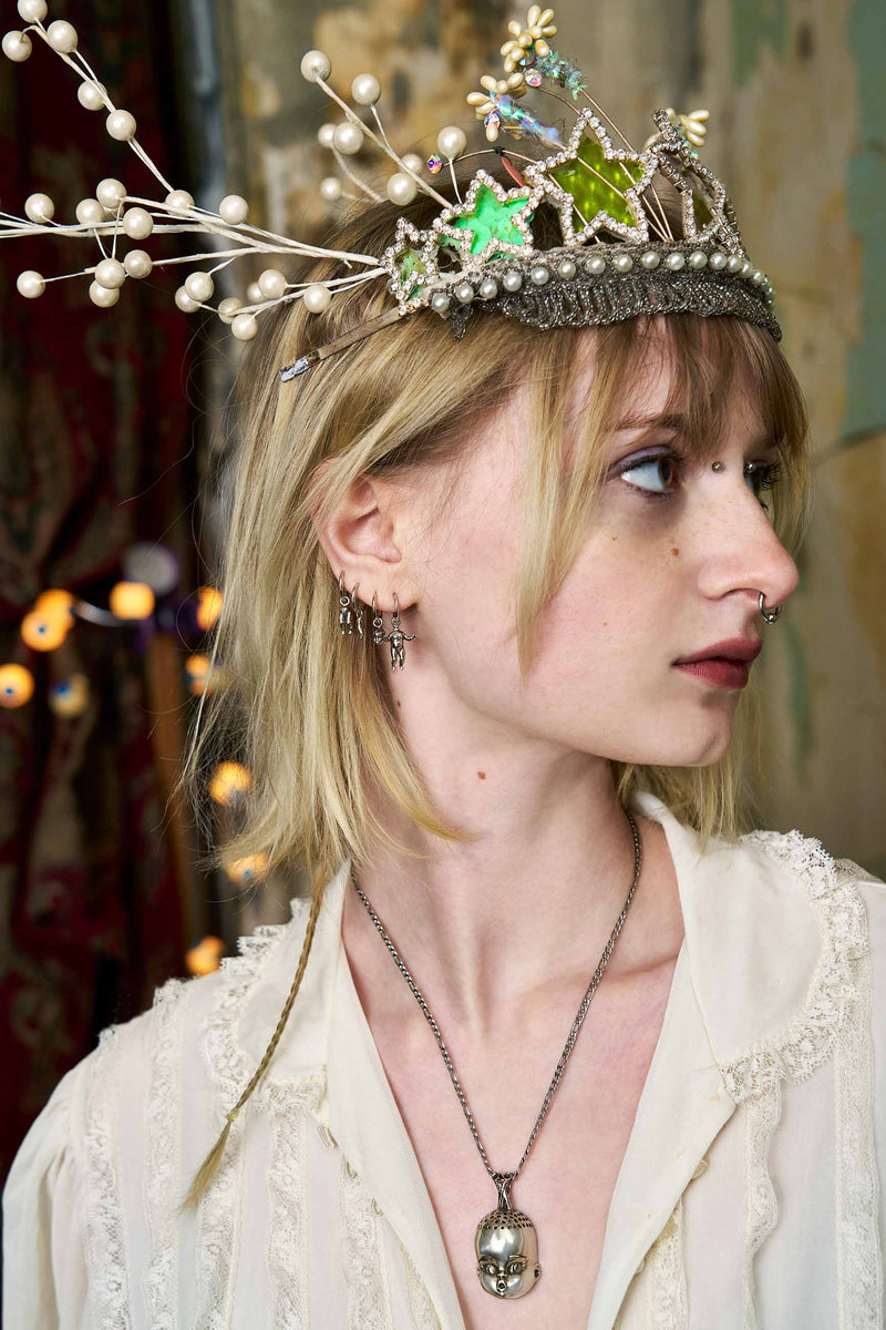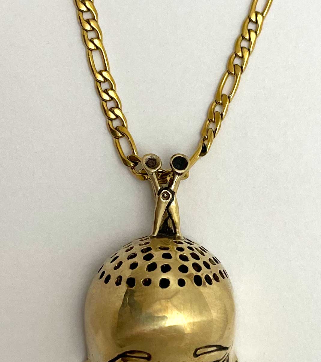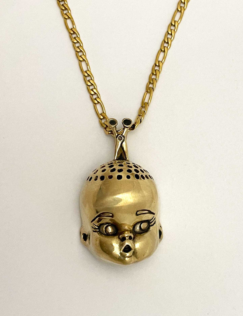 She hangs on a figaro chain. I used this style because now I see this version of her new do as totally punk. That doll is one tough cookie.