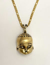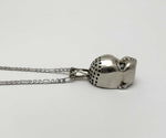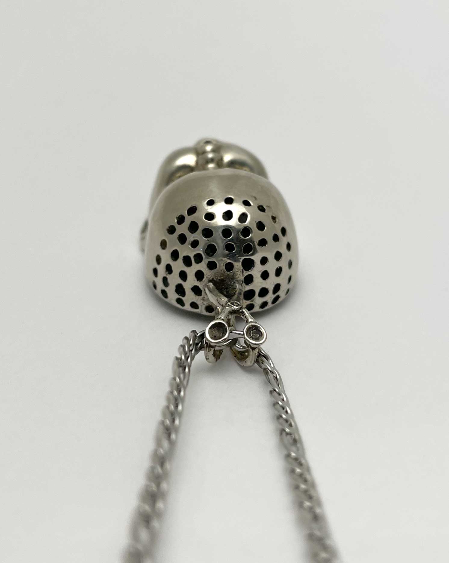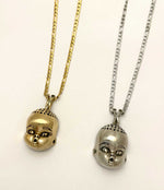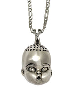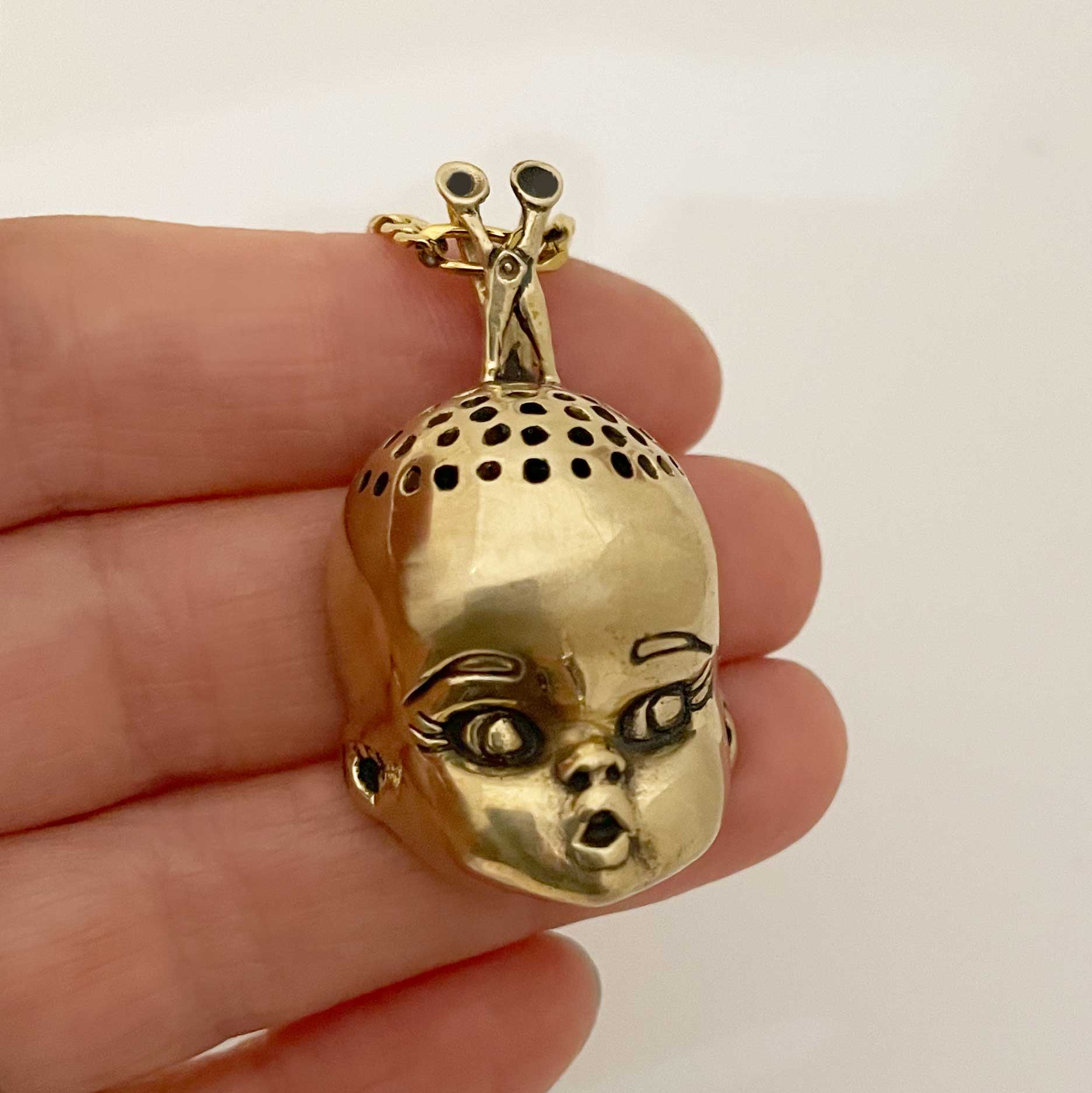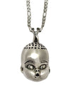 The doll head measures a little over an inch from head to chin. The scissors add just under a half inch to the hanging legnth. The silver tone and gold tone chains are 16 inches in legnth.