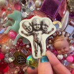 I made these stickers from a photo I took of the 3 headed baby necklace that I hand make. Unlike the Three Headed Baby Ring or the Three Headed Baby Necklace,  you can put this sticker ANYWHERE!!!!! Please see photos for ideas. Innovative places include water bottles (It's water proof!!), your computer, and, your bicycle! Charge your strange baby by placing them in bright light. Absorbed light energy is then slowly released over an extended period of time, making them glow.