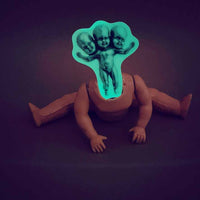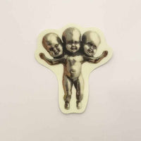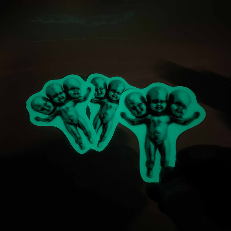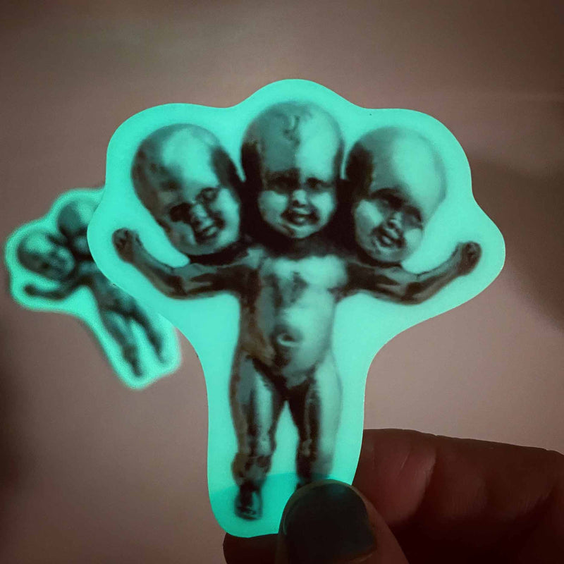 What's better than my Three Headed Baby Sticker? The Glow In the Dark 3 Headed Baby Sticker you see here!! When I collected stickers as a kid, it was rare to get a glow in the dark. You need not look further for your favorite, as this quality, vinyl, weatherproof sticker is guaranteed to glow again and again. Free shipping within the U.S.!